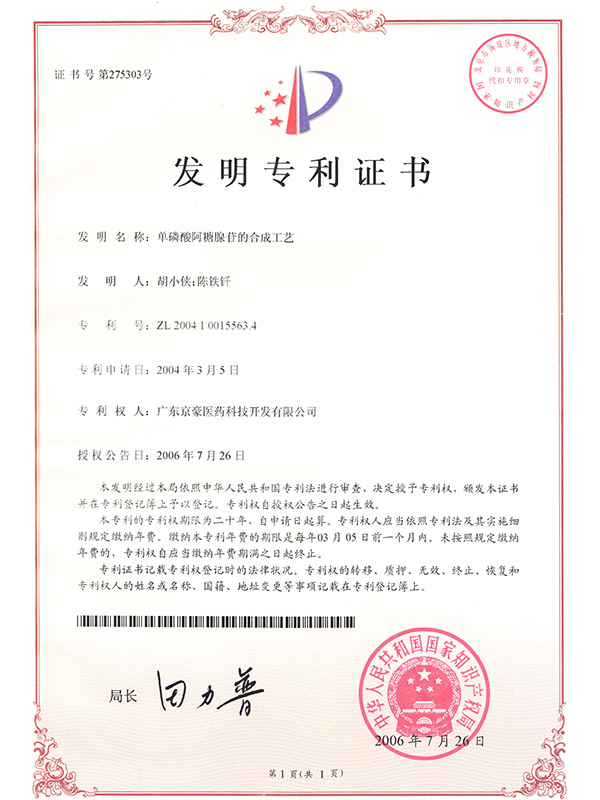 獲得“抗乙肝藥物阿德福韋酯合成方法”專利證書獲得“單磷酸阿糖腺苷的合成工藝”專利證書